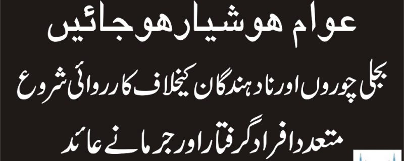 مظفرآباد(اسلام آباداپ ڈیٹس)محکمہ برقیات کی بجلی چوروں اور نادہندگان کیخلاف کارروائی ‘ 5افراد گرفتار ‘ درجنوں کنکشن منقطع ‘ 97لاکھ روپے کی ریکوری جبکہ 20لاکھ روپے جرمانہ ‘تفصیلات کے مطابق گزشتہ روز ایس ڈی او سٹی ۔II احتشام قریشی ‘ ریکوری افسر صابر نقوی اور انچارج ٹیم مدثر اعوان نے گوجرہ سیکشن میں کارروائی کرتے ہوئے بجلی چوری کرنے والے 5افراد کو گرفتار کروا دیا جبکہ متعدد بجلی چوروں کو 20لاکھ سے زائد کے جرمانے کرتے ہوئے بجلی کے کنکشن بھی منقطع کردیئے ۔ ریکوری ٹیم نے دوران کارروائی 97لاکھ سے زائد کی رقم خزانہ سرکار میں جمع کروا دی ۔