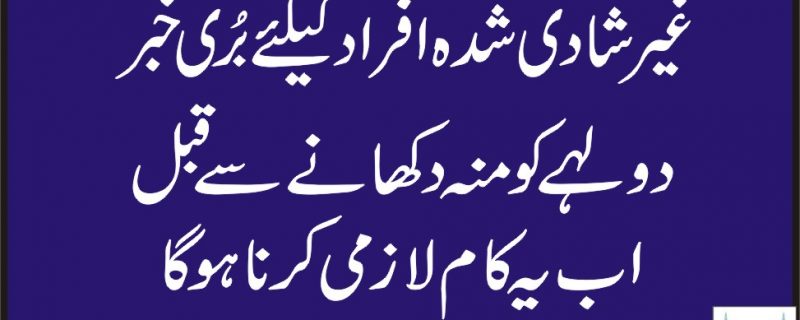 (اسلام آباداپ ڈیٹس) غیر شادی شدہ افراد کیلئے بری خبر ‘دولھا کو منہ دکھانے سے قبل 20ہزار روپے ایف بی آر کو ودہولڈنگ ٹیکس اداکرنا ہوگا ٹی وی رپورٹ کے مطابق ایف بی آر نے شادی ہال میں تقریبات پر ود ہولڈنگ ٹیکس لگادیا یہ ٹیکس شادی ہالوں میں نئے رشتوں میں بندھنے والے جوڑوں پر ہوگا جنوبی پنجاب بہاولپور ڈویژن سمیت راولپنڈی‘ اسلام آباد‘ گوجرانوالہ اور آزاد کشمیر کے علاقے شامل ہیں.